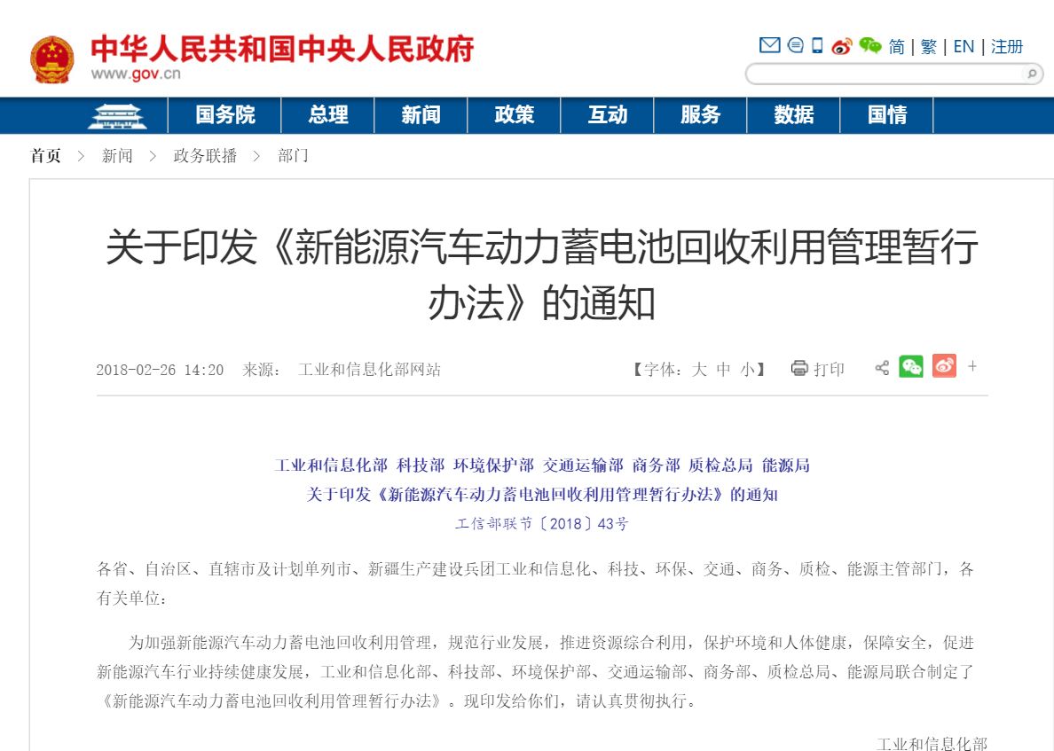 新能(néng)源汽車(chē)動力蓄電(diàn)池回收利用(yòng)管理(lǐ)暫行(xíng)辦法