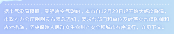 據氣象部門(mén)預報(bào),受強冷(lěng)空(kōng)氣影(yǐng)響,本市(shì)自(zì)12月(yuè)29日(rì•)起開(kāi)始大(dà)幅度降溫,風(fēng)力明(míng)顯增大(dà),12月(yuè)31日(rì)至2021年(nián)1月(yuè)1日(rì)市(shì)區(qū)最低(d↕ī)氣溫達零下(xià)4℃—零下(xià)6℃,郊區(qū)最低(dī)氣溫達零下(xià)6℃—零下(xià)8℃,有(yǒu)嚴重冰凍。此次低(dī)溫雨(yǔ∑)雪(xuě)冰凍天氣正值元旦假期,為(wèi)确保城(chéng)市(shì)安全運行(xíng)和(hé)市(shì≥)民(mín)正常生(shēng)活,根據市(shì)領導要(yào)求,現(xiàn)就(jiù)有(yǒu)關工(gōng)作(zuò)λ緊急通(tōng)知(zhī)如(rú)下(xià):