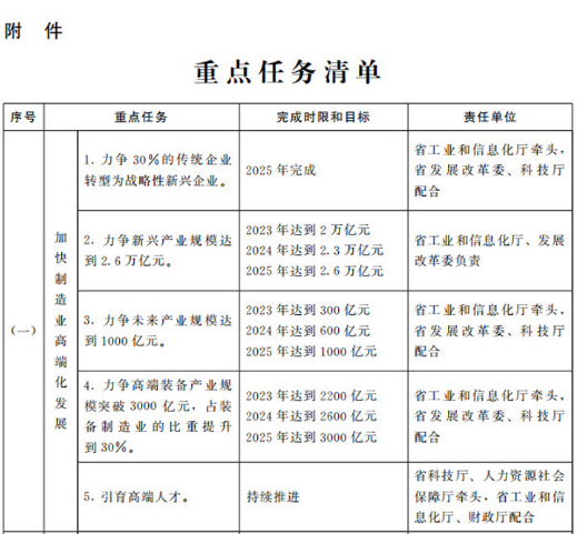 1.提升産業(yè)能(néng)級。深入實施換道(dào)領跑戰略,推進傳統産業(yè)高(gāo)端化(huà)、φ智能(néng)化(huà)、綠(lǜ)色化(huà)改造,加快(kuài)高(gāo)位嫁接,延鏈中高(gāo)端,形成“新制(zhì)造”,重點推進基礎材料、傳統裝備、傳統汽車(chēε)、食品和(hé)輕紡等轉型新材料、新裝備、新能(néng)源汽車(chē)和(hé)時(shí)尚消費(fèi)新品牌,到(dào)2025年(nián),力争30¥%的(de)傳統企業(yè)轉型為(wèi)戰略性新興企業(yè)。培育壯大(dà)新一(yī)代信息技(jì)術(shù)、高(gāo)端裝備、新材料、現Ω(xiàn)代醫(yī)藥等新興産業(yè),到(dào)2025年(nián),力争産業(yè)規模達到(dào)2.6萬億元,實現(xiàn)“五年(≤nián)倍增”。前瞻布局氫能(néng)與儲能(néng)、類腦(nǎo)智能(néng)、生(shēng)命健康、量子(zǐ)信息、未來(lái)網絡、前沿新材料等未來(lái)産業(&yè),強化(huà)關鍵技(jì)術(shù)儲備與攻堅,積極創建國(guó)家(jiā)未來(lái)産業(yèπ)先導試驗區(qū),到(dào)2025年(nián),力争産業(yè)規模達到(dào)1000億元。(責任單位:省工'(gōng)業(yè)和(hé)信息化(huà)廳、發展改革委、科(kē)技(jì)廳)