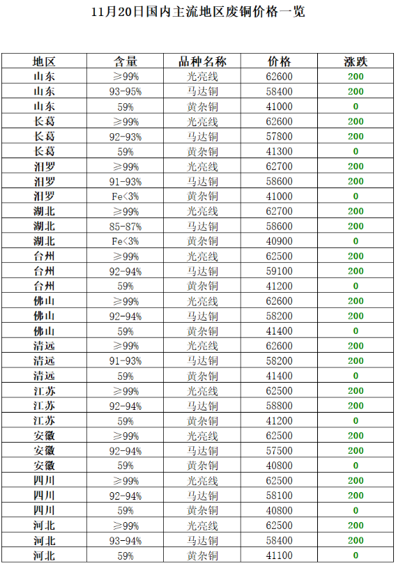 廢銅:今日(rì)中國(guó)再生(shēng)資源廢銅價格指數(shù)62591元/噸,較昨日(rì)上(shàng)漲2×00元/噸。11月(yuè)20日(rì),國(guó)內(nèi)現(xiàn)貨銅成交區(qū)間(jiān)68560-68630元/噸,較上(shàng)一(yī)交易®日(rì)價漲315元/噸,持貨商升貼水(shuǐ)對(duì)12合約b650-b720,升水(shuǐ)均值較上(shàng)一(yī)交易日(rì)漲™55元/噸。上(shàng)午北(běi)方臨沂、保定和(hé)佛山(shān)貨場(chǎng)廢銅最高(gāo)報(bào)價清光(guāng)-合股采購(gòu)價在63000-6310∑0元/噸,午間(jiān)盤中價格上(shàng)漲100元/噸。電(diàn)解銅升水(shuǐ)換月(yuè)結束,臨近(jìn)長(cháng)單簽訂現(xiàn)貨緊張升水(shuǐ)走強,廢銅現(xiàn)貨流量增加,精廢價差擴大(dà)至1815元/噸價差,落于合理(lǐ)線上(shàng)方,∑再生(shēng)替代性增強。宏觀方面市(shì)場(chǎng)交易預期國(guó)內(nèi)仍有(yǒu)消息落地(dì),同期海(hǎi)外(wài)通(tōng)脹降溫和(hé)經濟'衰退風(fēng)險,市(shì)場(chǎng)認為(wèi)本輪加息周期結束,流動性收緊影(yǐng)響減弱;國(guó)內(nèi)原生(shēnγg)電(diàn)解銅老(lǎo)大(dà)需求緊張,宏觀和(hé)基本驅動力向上(shàng),預計(jì)短(duǎn)期廢銅價格偏強調整。