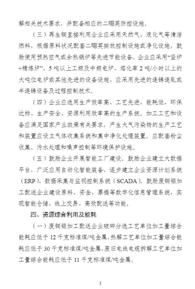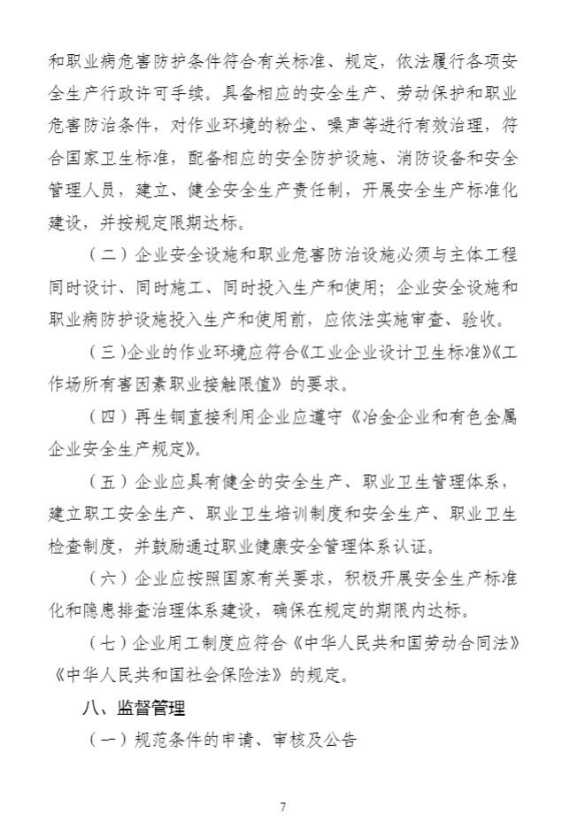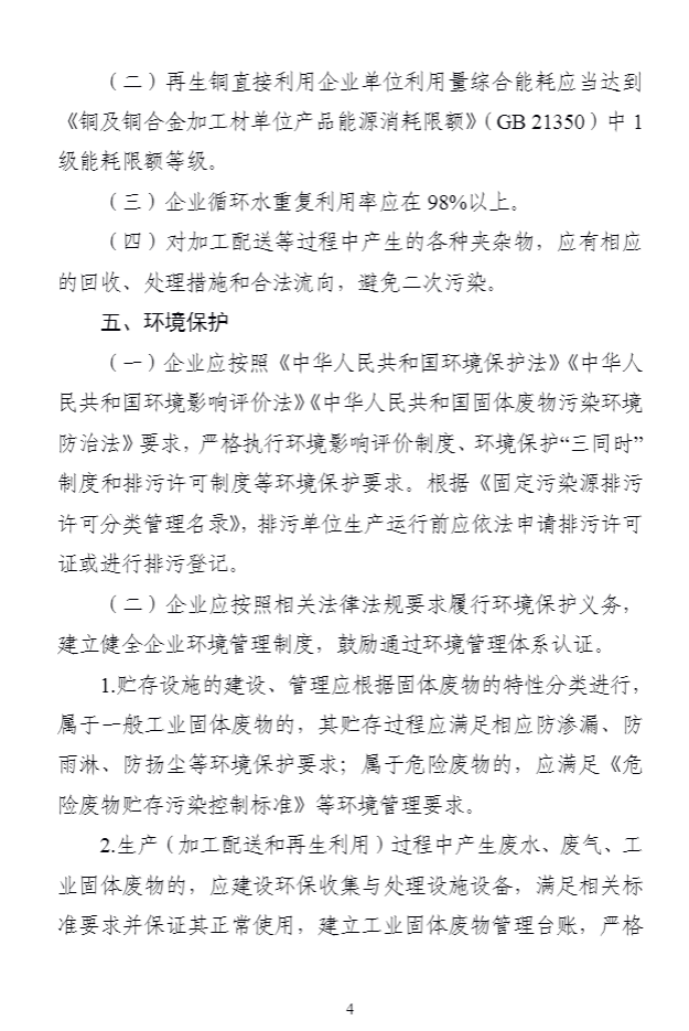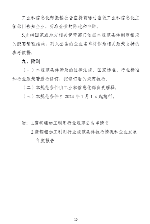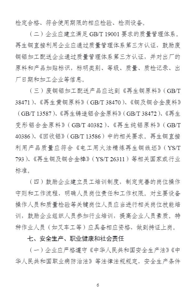 為(wèi)深入貫徹落實《中華人(rén)民(mín)共和(hé)國(guó)循環經濟促進法》《中華人(rén)民(m±ín)共和(hé)國(guó)固體(tǐ)廢物(wù)污染環境防治法》,引導廢銅、廢鋁加工(gōng)配送和(hé)利用(yòng)行(xín♦g)業(yè)高(gāo)質量發展,提高(gāo)精細化(huà)處理(lǐ)及直接利用(yòng)水(shuǐ)平,我部制(zhì)定了(le)《廢銅鋁加工(gōng)利用(yòng)行(xíng)業(yè)規範條件(jiàn)》,自(zì)2024年(nián)1月(yuè)1日(rì)起實施。