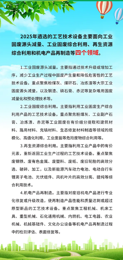為(wèi)加×快(kuài)推動工(gōng)業(yè)固廢源頭減量和(hé)規模化(huà)利用(yòng),提升再生(shēng)資源綜合利用 (yòng)水(shuǐ)平,發展高(gāo)端智能(néng)再制(zhì)造,工(gōng)業(yè)和(¥hé)信息化(huà)部、國(guó)家(jiā)發展改革委、生(shēng)态環境部編制(zhì)了(le)《國(guó)家(jiā)工(gōng)業 (yè)資源綜合利用(yòng)先進适用(yòng)工(gōng)藝技(jì)術(shù)設備目錄(2025年(nián)版)》,現(xδiàn)予公告。